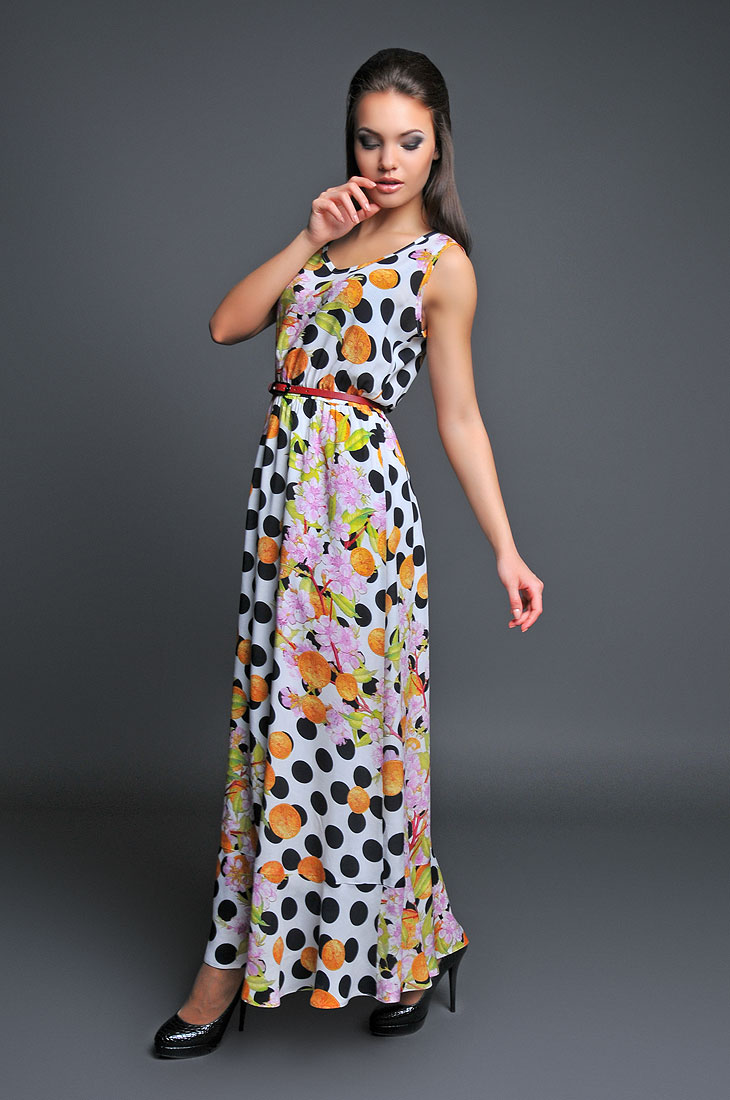 Платье-макси из штапельной ткани с оригинальным принтом. Платье с эластичной резиной по линии талии по низу дополнен отрезным воланом. Модель с фигурным вырезом горловины прекрасный вариант для лета.