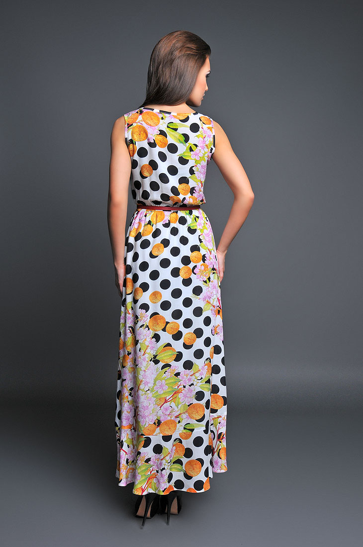 Платье-макси из штапельной ткани с оригинальным принтом. Платье с эластичной резиной по линии талии по низу дополнен отрезным воланом. Модель с фигурным вырезом горловины прекрасный вариант для лета.