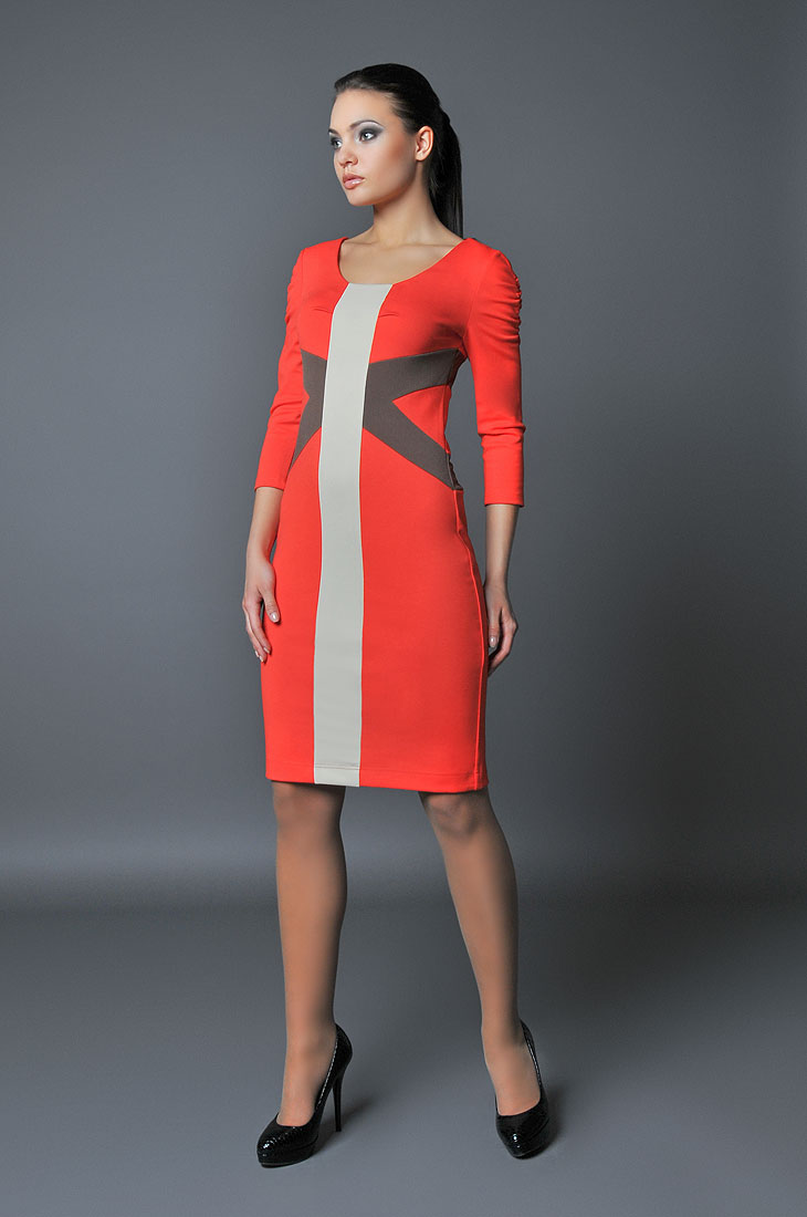 Платье из джерси . Коралловый цвет в классическом крое , декорированно горизонтальными и вертикальными полосами .Эта модель подчеркнет вашу индивидуальность.