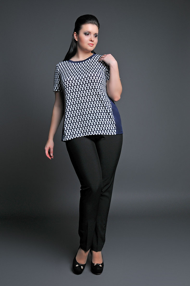 отражает самые актуальные тенденции. Перед и рукава выполнены из пестрой ткани, спинка и отделка по горловине -- из однотонной ткани. Блуза из комбинированного тонкого трикотажа покорит Вас своим лаконичным дизайном.