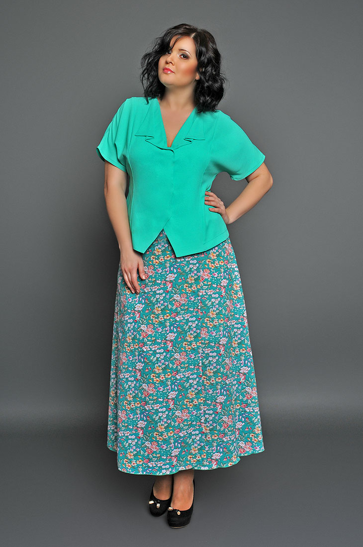 Прекрасная юбка актуальной длины, выполненная из легкого принтованного материала. Свободный крой с запахом по переду дарит комфорт и уверенность движений. Отрезная кокетка по переду украшена драпировкой с декоративным кольцом. Отличный вариант для женского гардероба.