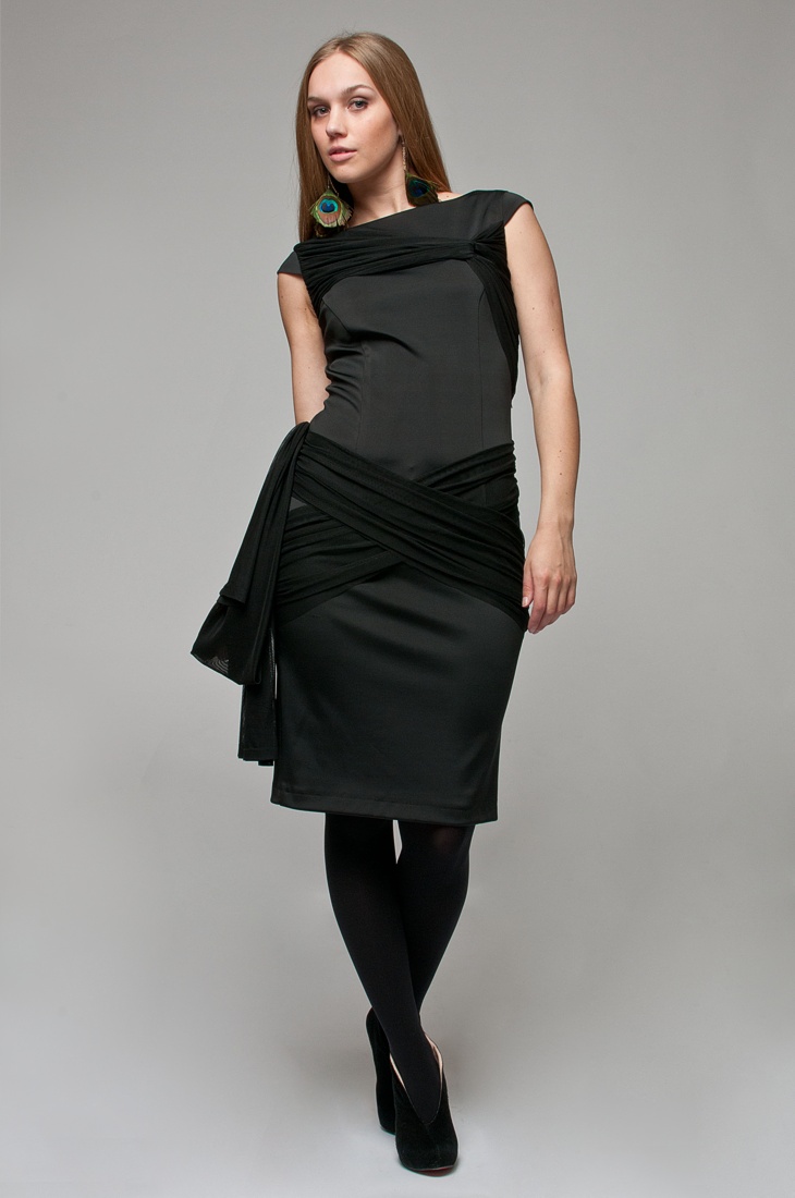 Нарядное платье из трикотажа прилегающего силуэта с маленьким втачным рукавом и декоративными деталями в виде задрапированной сетки по линии груди и бедер. Правая сторона платья с декоративным шлейфом из сетки. По линии рельефов настрочена декоративная тесьма. Размеры 42-50.