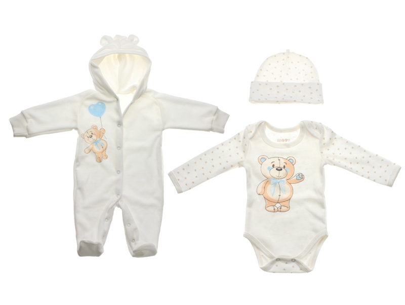 Комплект детской одежды для мальчиков, состоящий из трех предметов: трикотажное боди, шапочка с отворотом и теплый велюровый комбинезончик с капюшоном - это то, что нужно вашему малышу.
