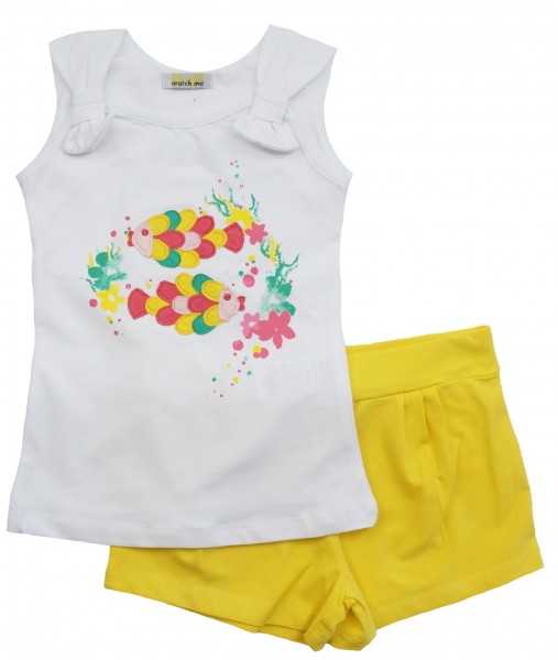 Удобная модель из мягкого трикотажа, футболка с яркой аппликацией и яркие шорты понравятся девочкам.