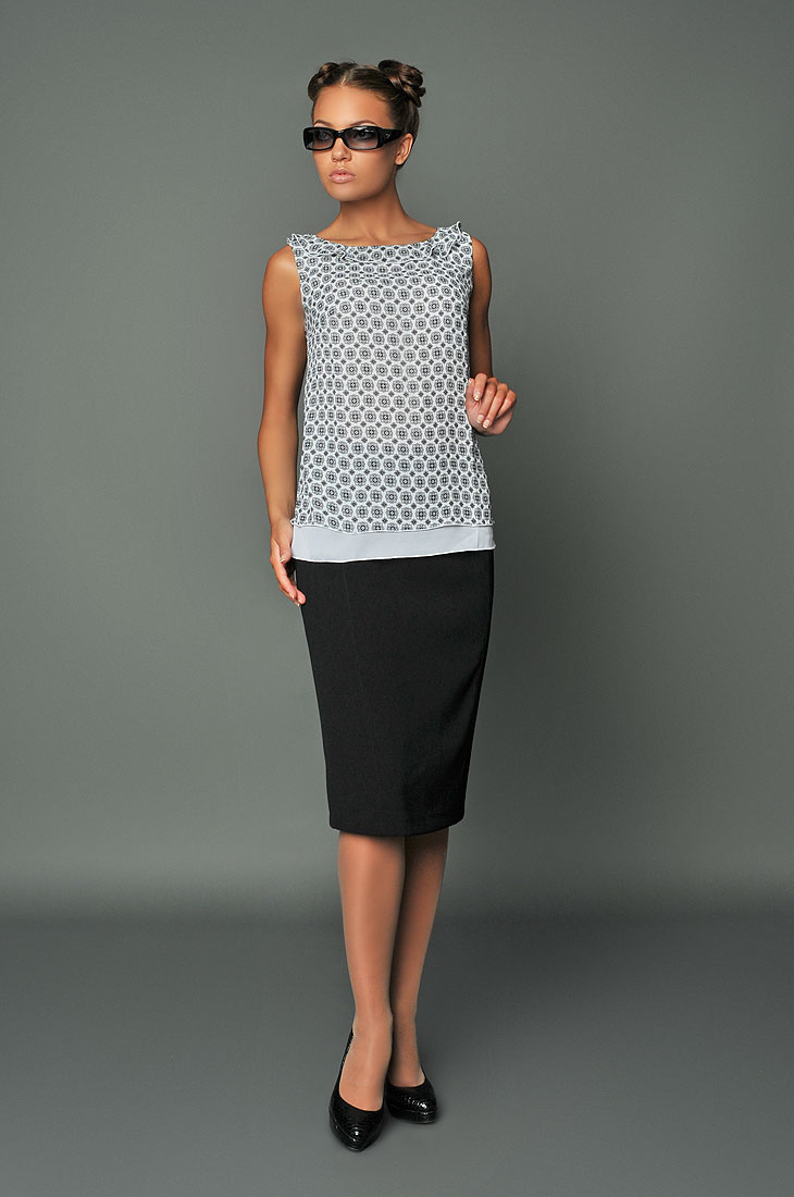 Легкая блуза прямого силуэта создана из легкого комбинированного шифона. Круглая горловина украшена по переду воланом. Модель с актуальным эффектом многослойности.
