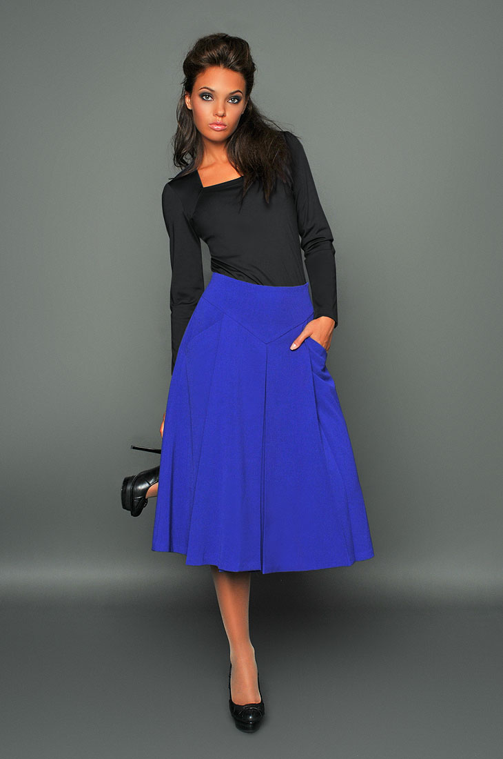 А-силуэт, облегающая бедра и постепенно расширяющаяся к подолу юбка напоминает форму буквы А, за что и получила свое название. Пик популярности этой модели пришелся на 60-е. Длина <<миди>> не позволит женщине замерзнуть, да и носить такие юбки можно, не опасаясь испачкать подол.