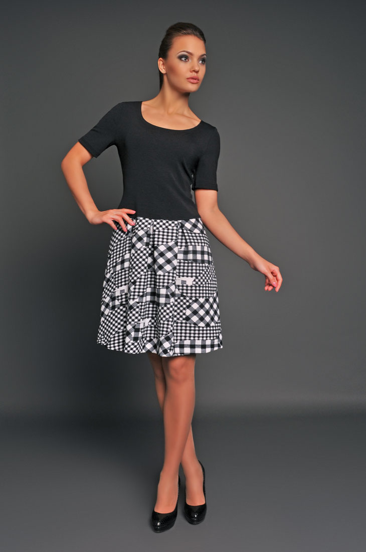 Платье <<два в одном>> сочетает в себе топ из вискозного трикотажа и юбку с актуальным принтом в клетку. Лаконичная модель с короткими рукавами и V-образной горловиной по спинке.