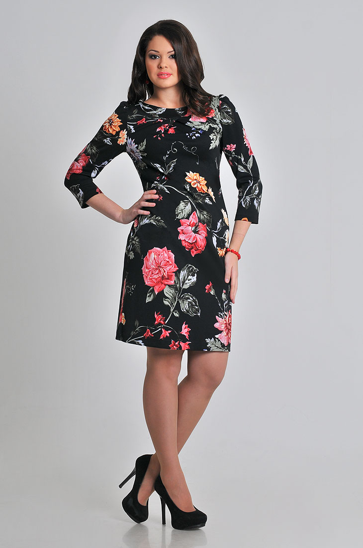Платье из джерси, элегантное и в тоже время динамичное,подчеркивающее отличный вкус обладательницы.Цветочный принт ярких оттенков на черном фоне и укороченный рукав,создают образ женственности и утонченности.