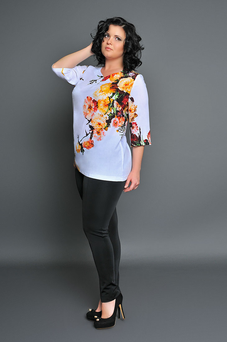 Туника в романтическом стиле порадует любительниц натуральных тканей и нежных расцветок. Фигурный V-образный вырез горловина украшен линией перламутровых пуговиц. Модель свободного покроя с втачными рукавами 3/4.