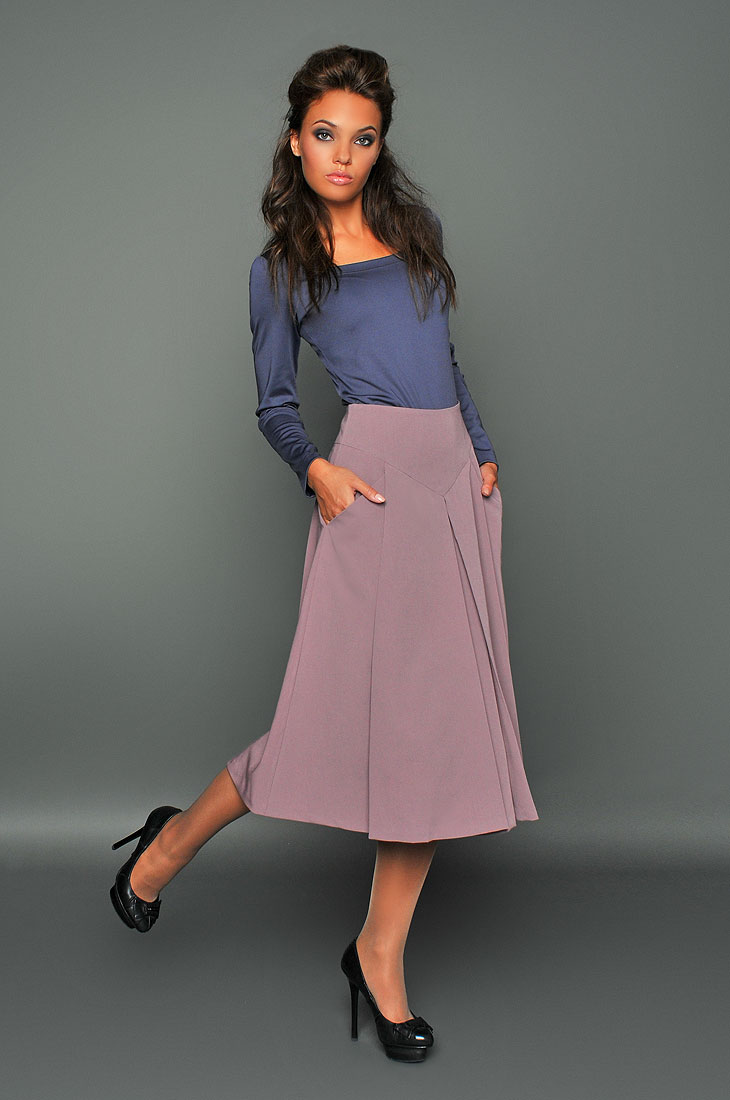А-силуэт, облегающая бедра и постепенно расширяющаяся к подолу юбка напоминает форму буквы А, за что и получила свое название. Пик популярности этой модели пришелся на 60-е. Длина <<миди>> не позволит женщине замерзнуть, да и носить такие юбки можно, не опасаясь испачкать подол.