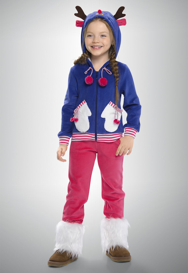 Задорный теплый комплект для девочек с веселой мордочкой и рожками на капюшоне. Внутренняя часть капюшона и необычные кармашки-варежки выполнены из мягкого иск. меха. Ваш ребенок будет с удовольствием носить костюм, в котором не только комфортно но и очень весело ;)
