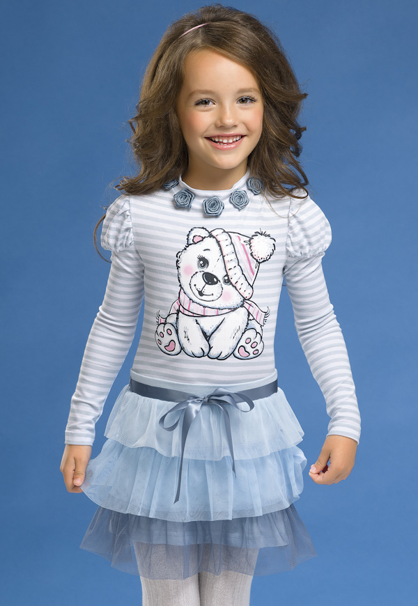 Романтичный комплект для девочек с очаровательным мишкой на джемпере. Джемпер с рукавами-фонариками и цветочками дополняет воздушная юбочка из градиентных воланов из мягкой сетки.