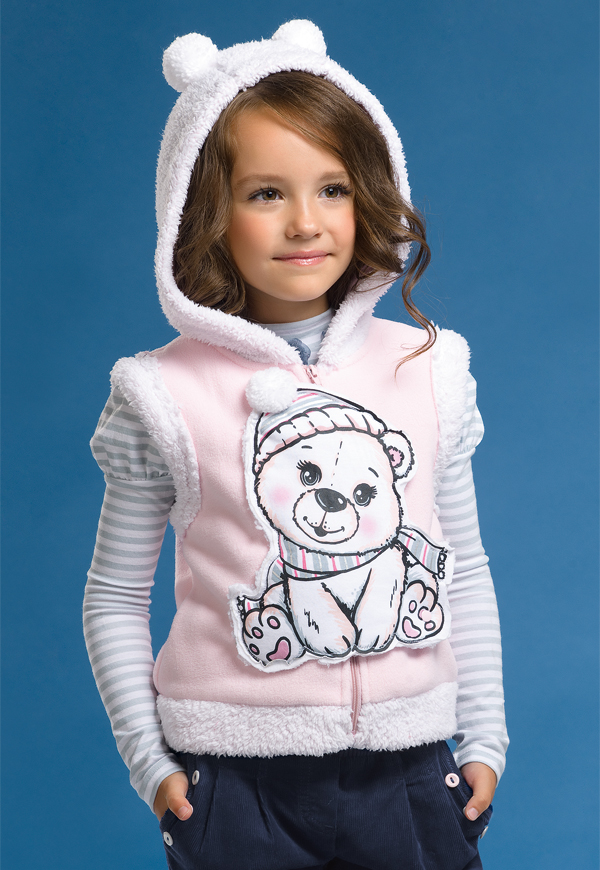 Мягкий, теплый флисовый жилет с внутренней частью и отделкой из иск. меха очень приятного на ощупь согреет в холодные дни. Модель декорирована объемной меховой аппликацией медвежонок с отлетной деталью на кнопке, на теплом капюшоне милые мягкие ушки.