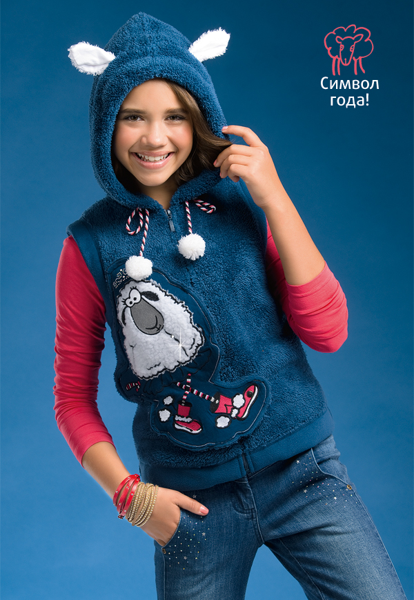 Теплый меховой жилет из мягкого иск. меха согреет в холодные дни. Модель с ушками на капюшоне - как символ 2015 года - овечки и объемной аппликацией с отлетной деталью на кнопке.