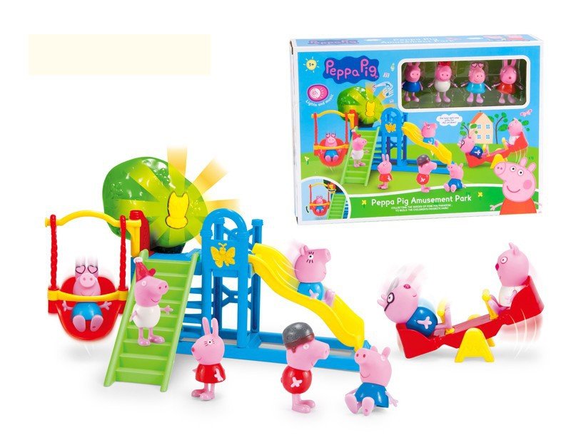 4 свинки с резиновыми головками, горка и качели.Высота игрушки 7см. Упаковка картонная коробка с окошком. Размеры коробки - 35см x 25см x 6см