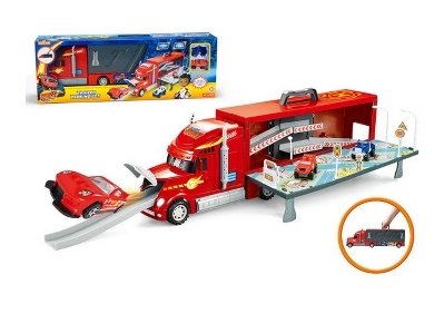 Внутри находятся дорожки, по которым можно съехать вперед или назад грузовика. В набор входят две машинки: Вспыш и еще один персонаж из мультфильма.