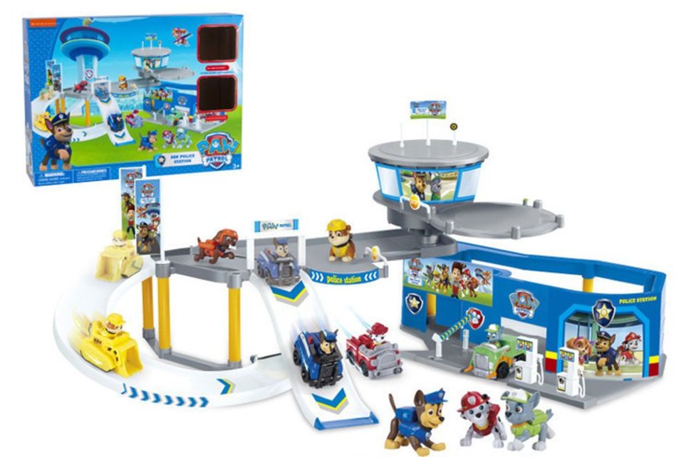 В набор входит: база, машинка Рокки и машинка Крепыша, либо машинка Гонщика и машинка Маршала. База представляет собой - 2 спуска: круговой и прямой; Большой гараж с двумя въездами; Площадка для вертолета крутящаяся; Крыша и основа второго этажа может служить крышей для гаража, т.к. тоже крутится; Шлагбаум.