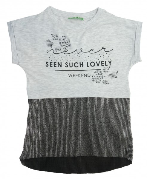 Удобная красивая модель из мягкого трикотажа, футболка украшена надписью со стразами и красивой золотистой плиссированной тканью снизу, понравится девочкам.